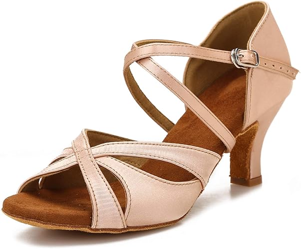 Capezio rosa social latin dance shoe features 2.5″ flared heel, satin (camel) or pu upper, suede sole, cushioned insole and speed buckle.